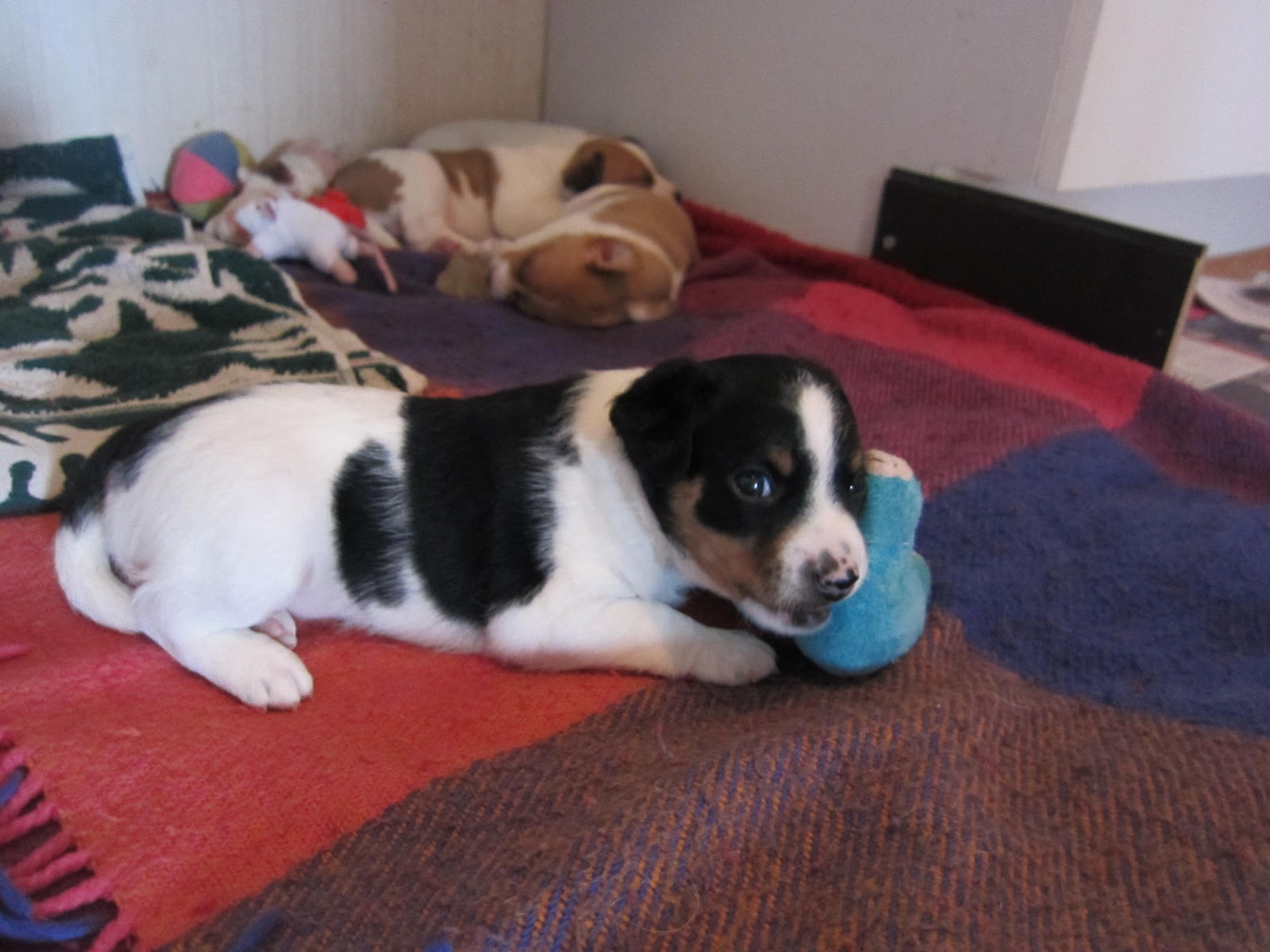 Pennuilla on ollut rauhallinen viikko, eli mitään sen ihmeempiä ei tässä ole tapahtunut. Muuten ei sitten olekaan ollut niin rauhallista :D Pennut touhuavat ihan mahdottomasti. Hampaiden tulemisen huomaa pureskelun tarpeen huomattavasta lisääntymisestä, ja pennuista alkaa paljastua hieman riiviömäisiä piirteitä :) Pennut osallistuvat jo paljon talon elämään, heräävät yleensä heti kun huoneeseen menee ja tulevat päiväsaikaan paljon tuvan ja eteisen puolelle. Hereilläoloajat ovat myös pidentyneet n. puoleen tuntiin, ja pennut tuntuvat tarvitsevan vähemmän unta hereilläoloaikojen välillä. Yöllä kyllä nukkuvat tosi sikeästi. Vettä ne ovat oppineet juomaan lautaselta, vaikka useammin taitavat kyllä vielä tassut sattua veteen :D Ruokaa ne saavat nyt kolme kertaa päivässä, jauhelihaa sekoitettuna turvotettuihin muroihin tai pentu-NEU:hun. Ruoka maistuu yleensä jo hyvin, vaikka Vanda imettääkin vielä melko usein. Vanda käy pentujen luona lähinnä imettämässä ja tarkistamassa välillä että kaikki on ok. Sitten kun pennut touhuavat niin Vanda on mukana niitä kouluttamassa, kulkee suu auki ja koittaa ottaa pentuja suuhun :D